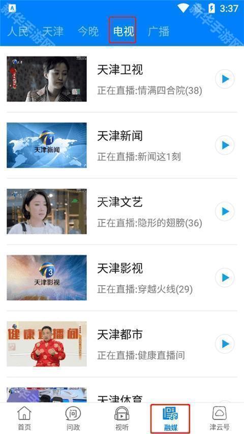 1、点击功能栏里面的“融媒”选择上方“电视”便能观看海量的现场直播频道。