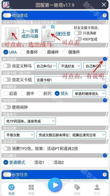 1、姬塔助手育成参数主要分布在【常规】【育成】两个标签中,其中的设置项一目了然,照着填就好了,不清楚的可以点蓝色问号,有一些说明,还不清楚的就保持默认就好