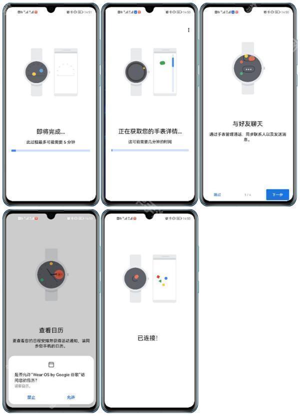 4、待Wear OS by Google 中国版 App 显示“已连接”后,按照Wear OS by Google 中国版 App 上的提示进行设置,之后等待Wear OS by Google 中国版 App 和手表完成同步。如果手表长时间停留在“在手机上继续设置”界面,请重置手表重新配对。配对过程中,需要同步手机通讯录等信息到手表,此过程需要几分钟时间,请耐心等待,注意将手机保持在亮屏状态,不要切换到手机其它应用,当Wear OS by Google 中国版 App 中需要手动设置时,及时设置,防止因为响应超时而导致配对失败。