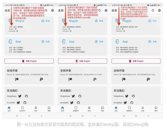 有些小白忘性大,设置里“隐藏Magisk应用”改了面具名称,第二天都忘了自己的面具版本。而且这种情况并不罕见,所以依靠“图标为脸谱、应用名称为Magisk”这个判断方法有一定的局限性。所以接下来,我教大家通过面具主页来判断面具版本。以下图一的面具主页均是官方面具的,从左往右依次是官方稳定版、金丝雀(Canary)版、调试(Debug)版。