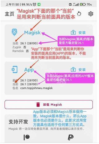 一、判断当前面具版本是看“Magisk”下面的那个“当前”,就是我图一中红色↓所指的那个“当前”;不是看“App”下面那个“当前”。千万要记住,不是用“App”下面的那个“当前”来判断。下面图二是对Magisk版本和App版本的引申解读,大家可以仔细看看。