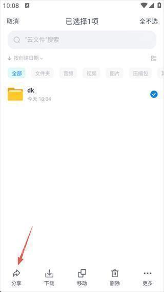 2、点击文件右侧的圆形选择框,勾选目标文件,在底部弹出的操作栏中,点击「分享」按钮。