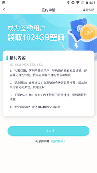2、点击一键申请,即可进行进行申请,申请审核通过之后就能成为签约用户。