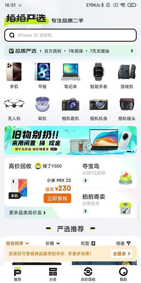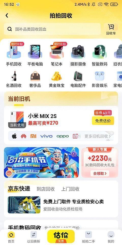用户在拍拍清仓APP上可以完成旧手机、数码、电脑、DIY配件、家用电器等多品类物品的回收变现。支持京东快递免费上门取件、京东合作回收商工程师直接上门检测、地铁站取件、顺丰快递免费寄送四种主要交易方式。回收业务具有品类广、流程清晰、操作便捷、信息安全、变现有保证等特点。