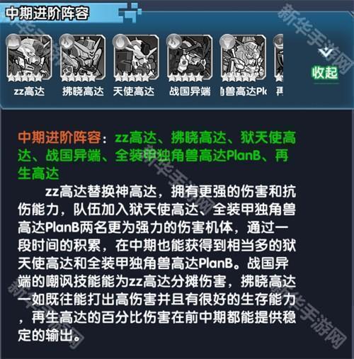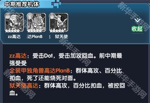 中期进阶阵容:zz高达、拂晓高达、狱天使高达、战国异端、全装甲独角兽高达PlanB、再生高达。