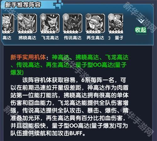 阵容特色:该阵容机体获取容易,6系每阵一名,可以在前期迅速拉开星级差距,神高达作为肉盾站第一位能打能抗,拂晓高达拥有很高的单体伤害和回血能力,飞龙高达能提供全队伤害增强,传说高达提供全队攻击、暴击、爆伤、精准叠加光环,再生高达具有百分比扣血伤害,并且回能极快,量子型O0高达(量子爆发)可为队伍提供续航和加攻击BUFF。