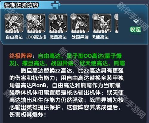 阵容特色:撒旦高达替换zz高达,比zz高达具有更强的伤害和抗伤能力;用自由高达替换全装甲独角兽高达PlanB,自由高达和熊霸作为当前最强群体机体毋庸置疑是核心输出机体;狱天使高达输出和生存能力仍然强劲;战国异端为核心输出英雄提供保护,这套阵容养成成型后,伤害极其爆炸!