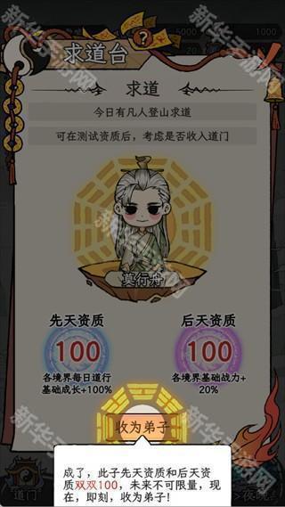 在求道台遇到先天+后天资质双100的弟子时,千万不要错过,这种资质出色的弟子,是宗门战力的核心。后续通过道行和战力的提升,他们会远超普通弟子。因此,优先将资源分配给这些顶级弟子,培养他们是宗门发展的关键。