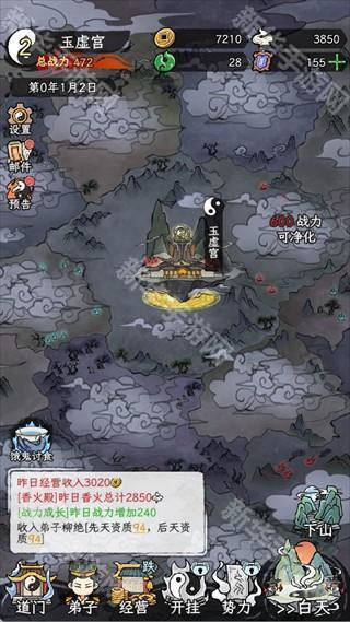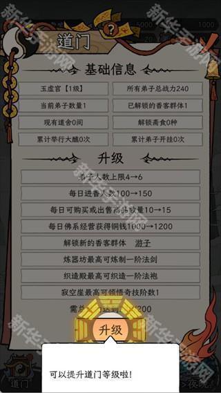 当总战力达到升级要求时,立即升级道门,升级后不仅会解锁更多弟子,还能开放炼器、织造等功能。同时,道门的升级能够提升每日进香人数和收入,是宗门扩张的关键。