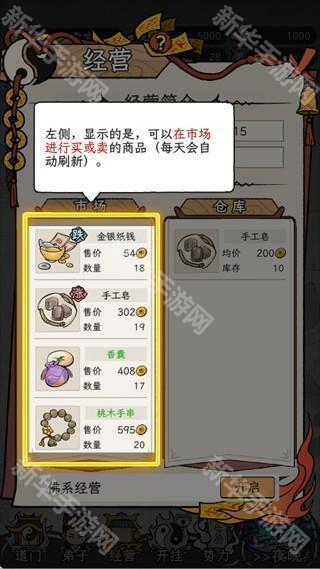 市场会每日自动刷新商品。优先购买【跌价】的商品,并通过低价买入、高价卖出的方式快速积累铜钱。你还可以开启佛系经营功能,这样就能稳定地获取每日铜钱,为弟子培养和宗门建设积累资金。