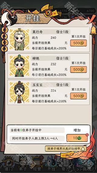对于核心弟子,首要消耗500铜钱开启第一次【开挂】,以提升他们每日的道行成长,快速提升战力。后续可以消耗灵玉解锁更多弟子同时【开挂】的功能,从而加速更多弟子的成长。