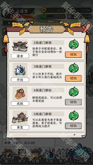 随着等级的提升,你会逐步解锁更多功能。例如,解锁道舍(2级)、开挂(3级)、成就(4级)、斋堂(5级)等。每个新功能的解锁都会极大提升弟子的成长和宗门战力,帮助你更好地规划和发展宗门。