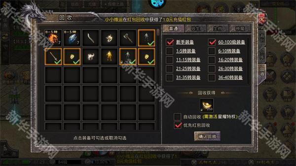 3.游戏中的所有装备都可以通过红包回收兑换大量充值红包,装备级别越高,可以兑换的红包就越多。