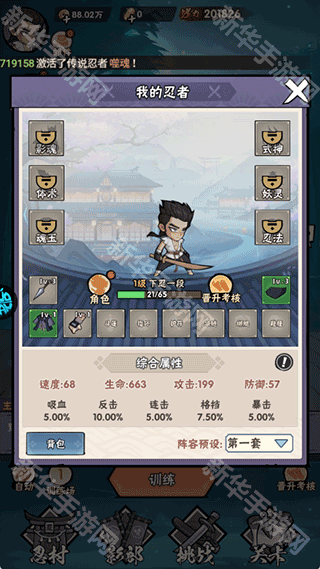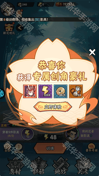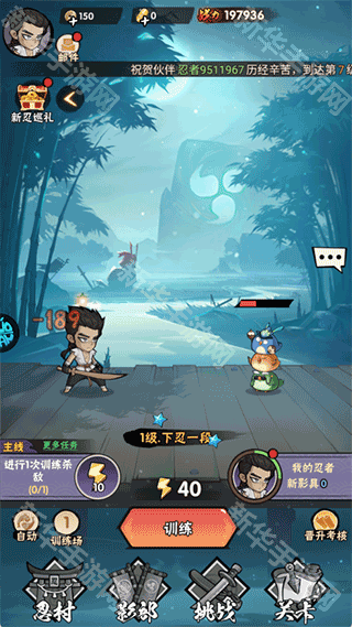 1、按照主线关卡顺序依次训练挑战,前期关卡难度较低,主要目的是让玩家熟悉游戏操作与基本玩法。每通过一个关卡,都能获得一定数量的金币、经验以及基础忍具。