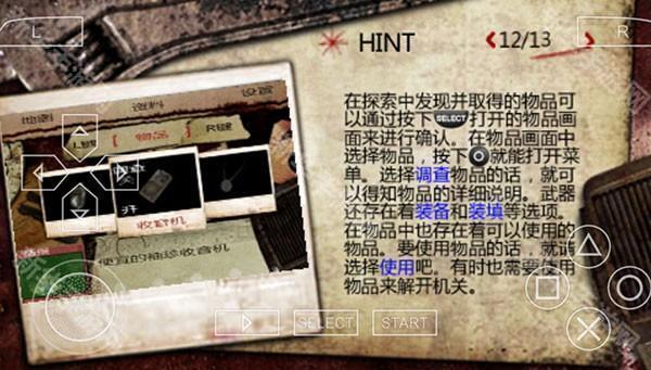 2、在探索中发现并取得的物品,可以通过按下“select”打开的物品画面来进行确认,在物品画面中选择物品,按下“圆圈”就能打开菜单。选择调查物品的话,就可以得知物品的详细说明,有时也需要使用物品来解开机关。武器还存在着装备和装填等选项。