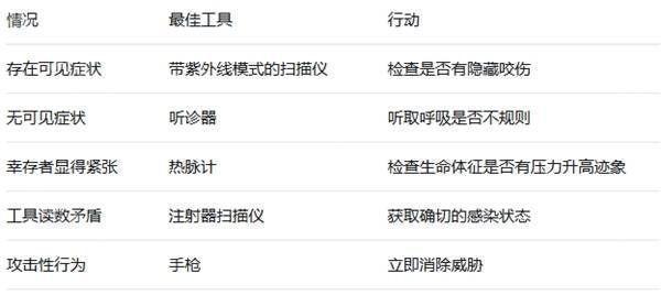 最明显的迹象,但幸存者会将其隐藏在衣物或绷带下。使用你的紫外线扫描仪来揭示隐藏的伤口。一处咬伤意味着立即进行清除处理。
