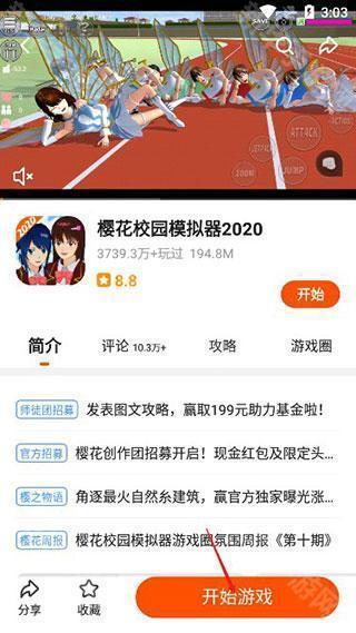 5、如下图,例如选中樱花校园模拟器进入,这里有详细的攻略和游戏圈,并且可以一键开始游戏;