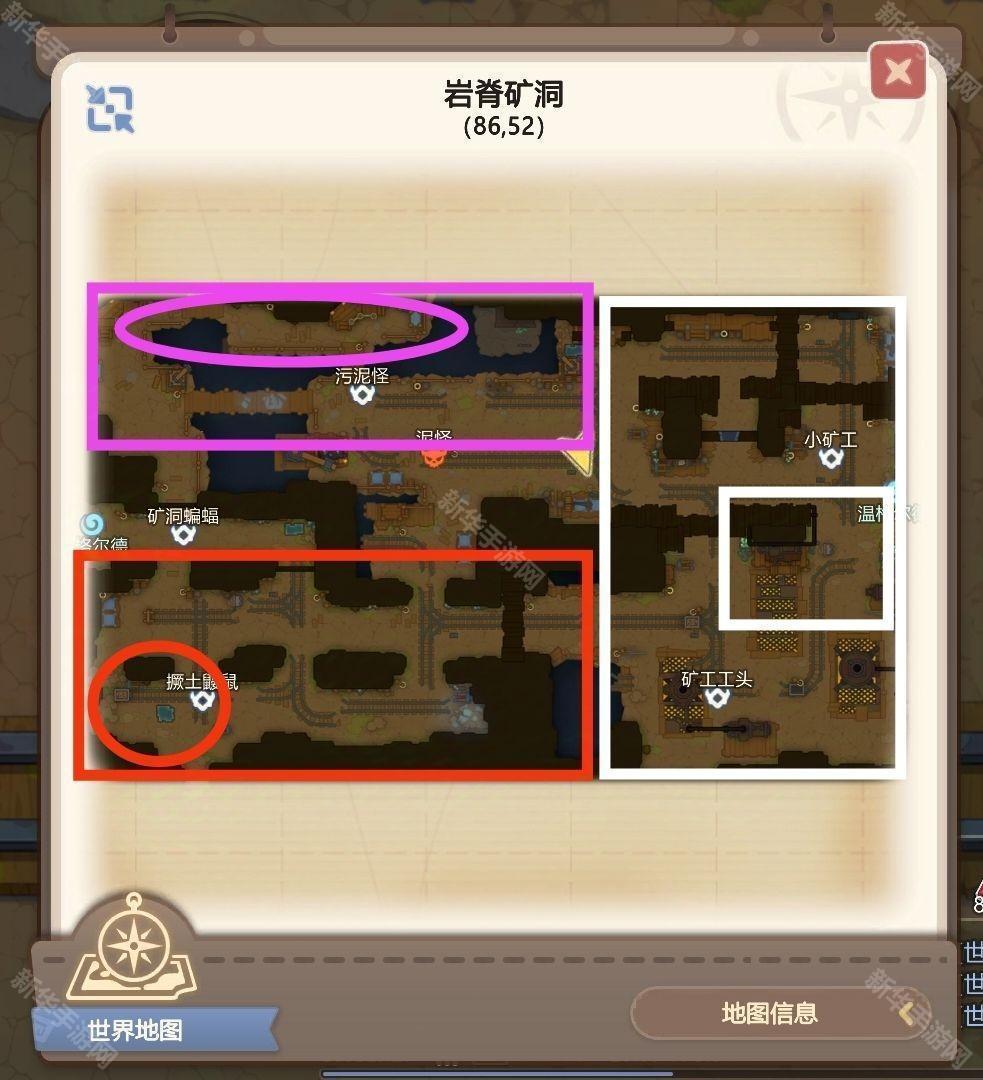 矿洞里的矿石类采集★ 小框里是采集点比较聚集的地方。