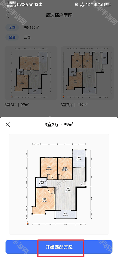 4、输入小区名称后会进入户型的选择,选择后点击开始配案
