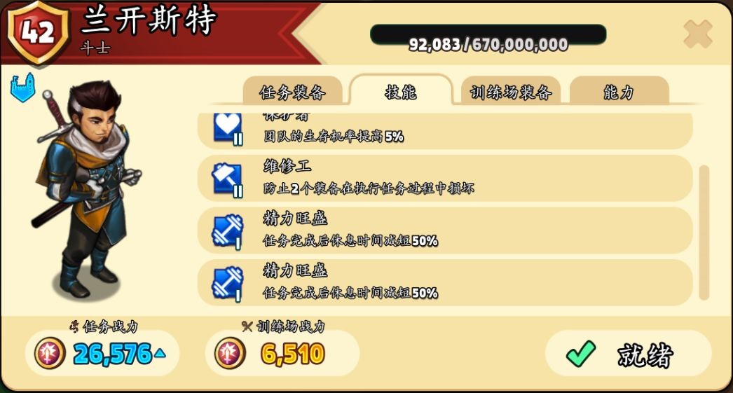 技能重复可以叠加,比如图中的兰开斯特带有两个『精力旺盛 I』,加起来就是 100%,也就是没有休息时间了。