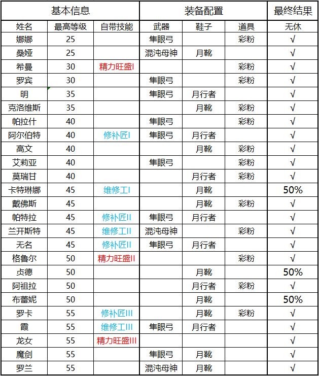 效果:22 个英雄 100% 无休,3 个英雄 50% 休息(对,还是那三个钉子户!)。