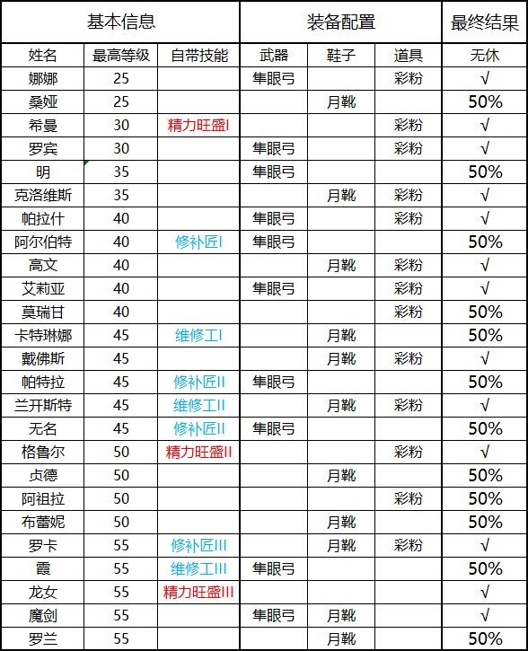 效果:13 个英雄 100% 无休,12 个英雄 50% 休息。