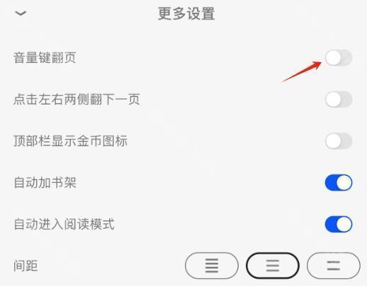 5、在新的弹出页面中,找到【音量键翻页】的选项按钮,点击开启即可设置完成