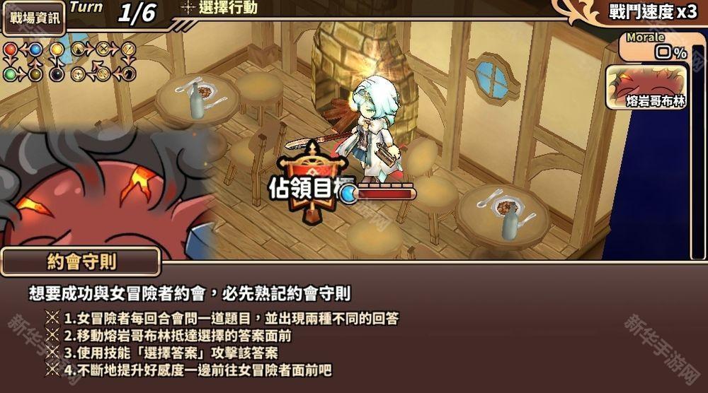 「与女性冒险者的约会练习」关卡中玩家可以看到左右两边显示数字,女冒险者将会提出问题,玩家需要根据自己想选择的答案、将「熔岩哥布林」移动到「左边答案 (数字)」或「右边答案 (数字)」,记得要使用技能「选择答案」攻击该答案 (数字),玩家也可以点选左边 / 右边数字并查看「被动」观看该数字的回应。小提醒:第一回合要走到数字「1」的前面、第二回合要走到数字「2」的前面,以此类推!