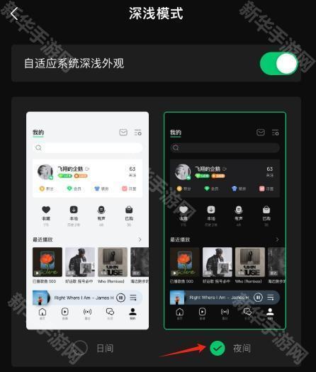 4、进入【深浅模式】的设置页面,勾选下方的【夜间】圆圈,即可设置深色模式