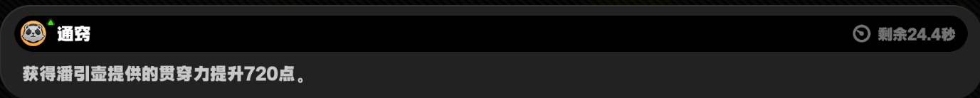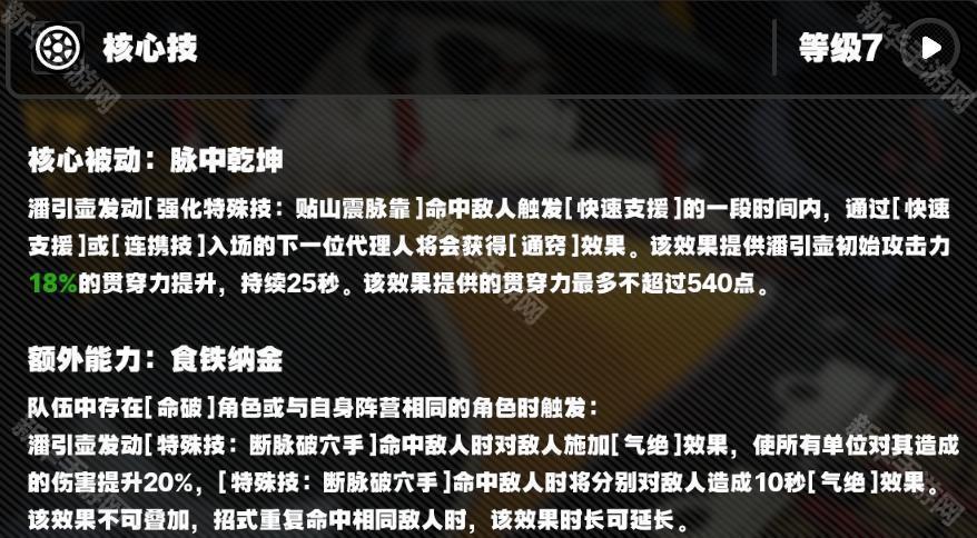 1、发动【强化特殊技】触发【快速支援】期间内,角色通过【快速支援】、连携技接战会获得【通窍】效果,可基于潘引壶攻击力按一定比例转化为贯穿力加成,持续25秒;