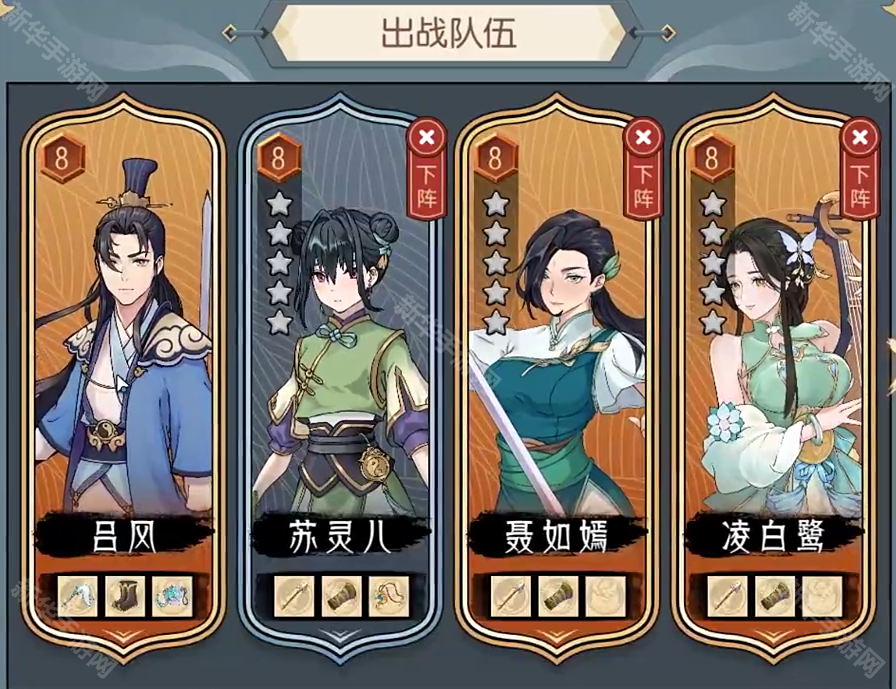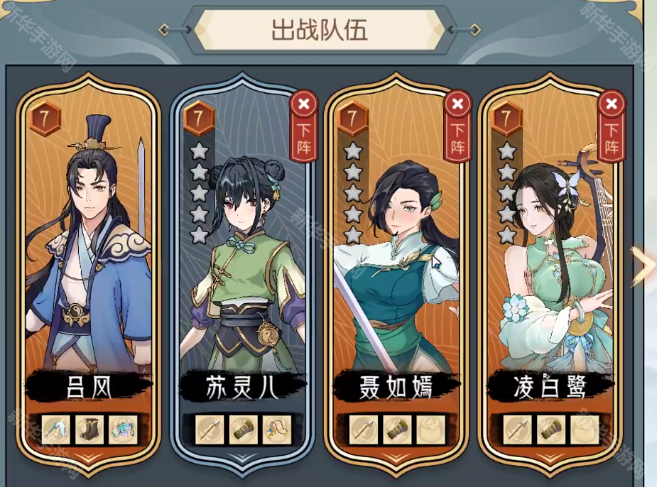 1-4关阵容(7级):吕风(主线赠送装备灵虚拂,水护踏渊,水云佩)、苏灵儿(起潮破军,漪盾当山臂,蓄浪坠)、聂如嫣(唤冰破军,汐浪当山臂)、凌白鹭(赤潮破军,漪盾当山臂)