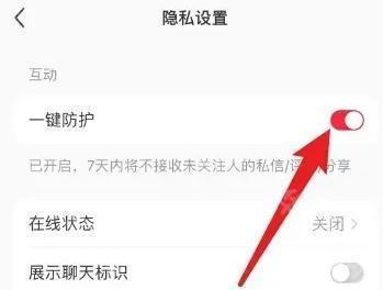 4、最后,在隐私设置的页面,找到【互动】-【一键防护】的按钮,并点击开启