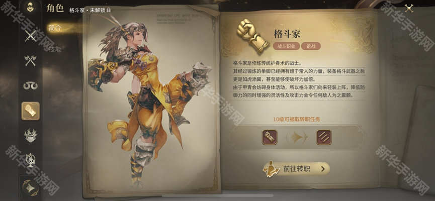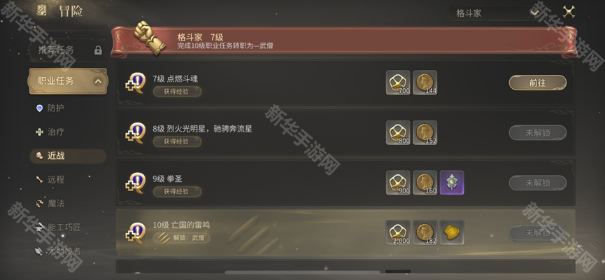 答:完成主线任务【海之都与森之都】后前往【格斗家行会】接取任务,完成10级任务后即可转职为武僧。