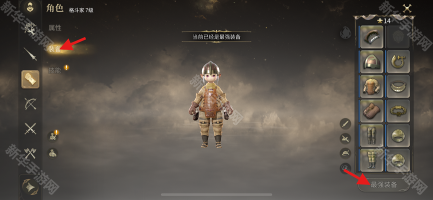 5、完成6级任务后,我们已经获得了一整套5级的武器和防具,记得及时装备,如果还没有装备,可以点开角色界面,选择装备,一键装备最强装备。