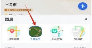 2、在搜索结果的页面,点击右上角的【图层】选项,在下方弹出的菜单栏中选择【卫星地图】