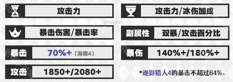 ①2件套+15%冰伤,4件套在元素能量为0时提高普攻、大招60%伤害,可不错地应对丝柯克站场与大招两种玩法。