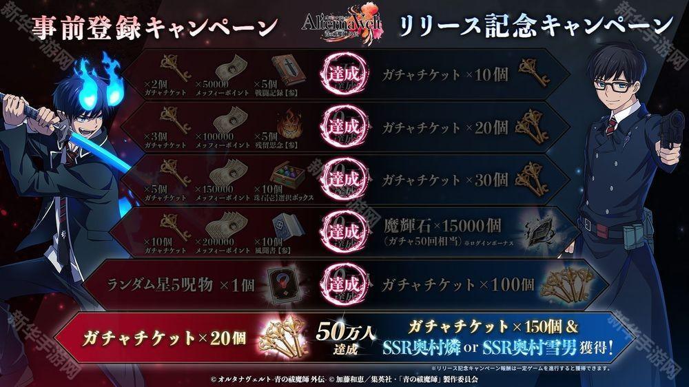 官方表示,《AlternaWelt -青之驱魔师 外传-》的事前登录人数已突破 40 万人。当突破 50 万人时,最多可获 400 抽转蛋券与 SSR 奥村燐 or SSR 奥村雪男的事前预约活动持续进行中。