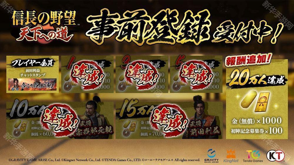 《信长之野望 天下之路》的事前登录活动持续进行中,由于事前登录人数已突破 15 万人,官方宣布追加登录人数达 20 万人的达成奖励:金(无偿)×1,000、首战纪念招募券 ×100。