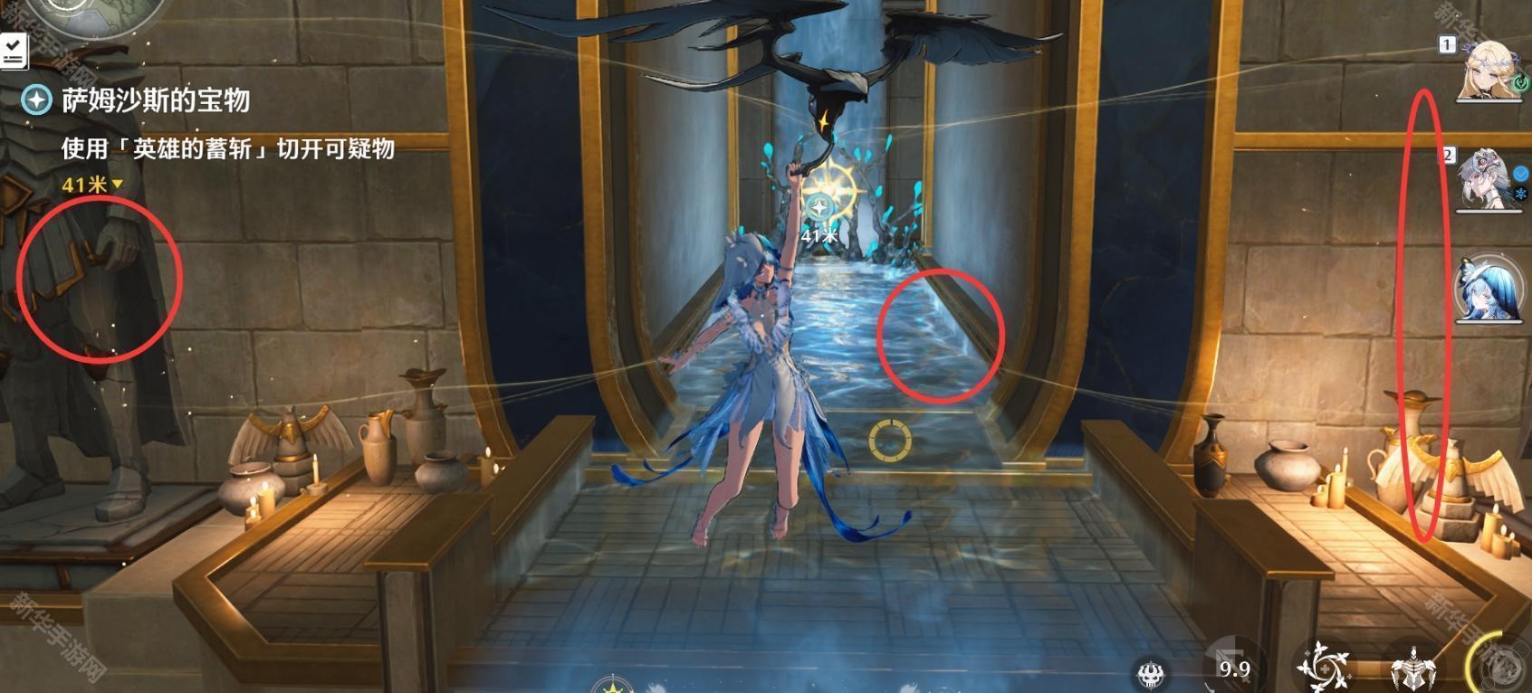 3、对话结束后,跟随任务指引,前往水道下游收集3个物品(如图所示的红圈位置)