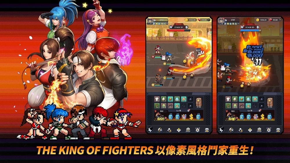 《THE KING OF FIGHTERS AFK》发想自 SNK「The King of Fighters」IP。这款游戏採用了「The King of Fighters」系列中的代表性角色,并以像素风艺术重新诠释,这种画面风格与玩家在 Neo Geo Pocket Color 上《格斗天王 R-2》中所熟悉的相似,让玩家可以建立自己喜欢的格斗家队伍并享受动态战斗。同时,5v5 的团队战斗将强烈提升游戏刺激感,让玩家可以透过组合不同的角色和阵型来策略性地打造专属队伍。