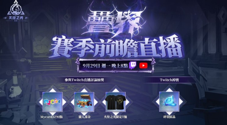 官方粉丝团释出一系列前瞻观看活动,9 月 22 日起至 9 月 28 日止,于指定活动贴文留言指定文字并 @好友,就有机会抽中 3280 原晶、MyCard 500 点等奖励,并且本次只要参与活动即可获得碎裂原晶!前瞻当天于直播聊天室留言更有机会获得「火炬之光限定 T 恤」还不呼朋引伴一起共享前瞻盛举!