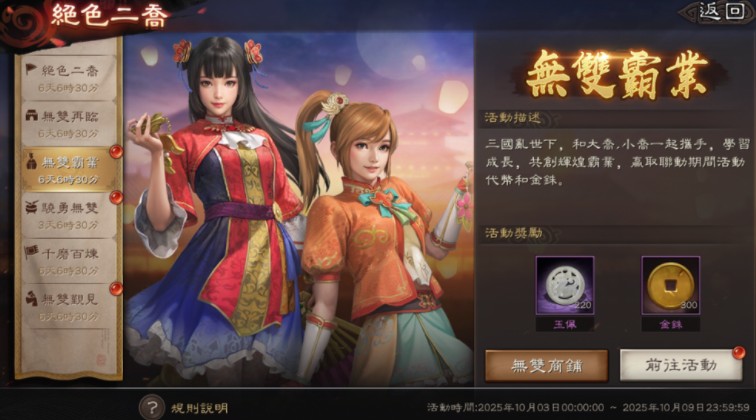 官方指出,本次除了玩法与赛事的升级外,玩家即日起至 10 月 28 日登入即可领取 1000 金铢,联动活动期间参与活动还能免费获得金将「无双小乔」;更有万能事件战法材料卡与战法回溯武将限定道具,全面支援玩家强化阵容与灵活调整策略。