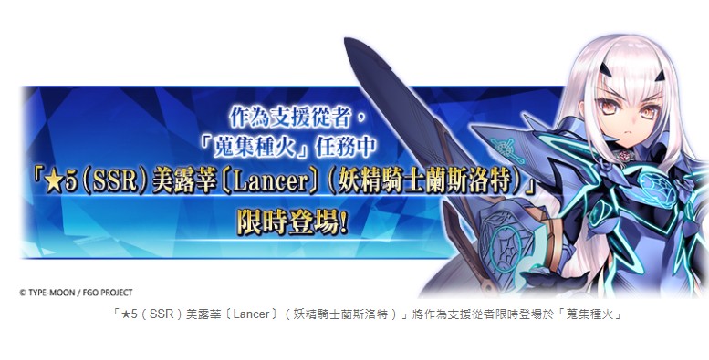 2025 年 9 月 23 日(二)维护后至 2025 年 10 月 7 日(二)12:59 期间,强化从者及概念礼装时,大成功(经验值 2 倍奖励)、极大成功(经验值 3 倍奖励)的发生率,将限时提升为 2 倍;「蒐集种火」任务将每日开放,且 AP 消耗量也将限时降为 1 / 2。而「蒐集种火」中「★5(SSR)美露莘〔Lancer〕(妖精骑士兰斯洛特)」将作为支援从者限时登场。