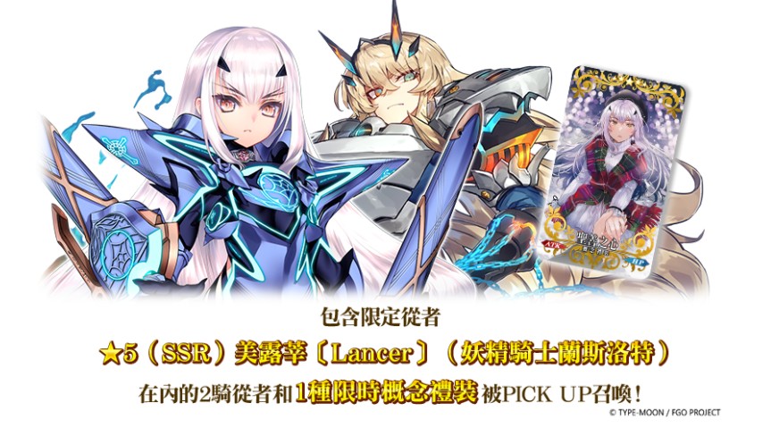 自 2025 年 9 月 23 日(二)维护后至 2025 年 10 月 7 日(二)12:59 期间,将开放召唤包含「★5(SSR)美露莘〔Lancer〕(妖精骑士兰斯洛特)」等 2 骑从者,以及限时概念礼装「★5(SSR)圣善之心」。