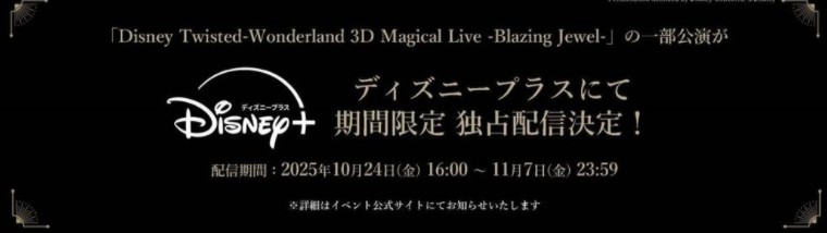 该情报是在 10 月 11 日至 13 日举办的 3DCG 演唱会活动「Disney Twisted-Wonderland 3D Magical Live -Blazing Jewel-」上公布。
