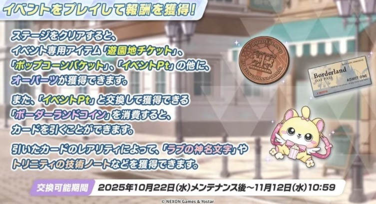通过活动 Stage 时,将能获得「游乐园门票」、「爆米花桶」、「活动 Pt」以及欧帕兹。其中,活动 Pt 可用于兑换「边境硬币」,使用边境硬币抽取卡片,就有机会获得「良舞的神名文字」与三一技术笔记等奖励。