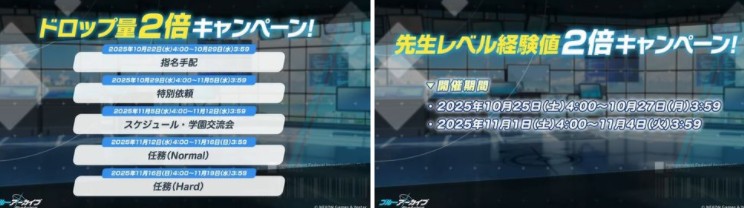 掉落量 2 倍活动将于 10 月 22 日 03:00 至 11 月 19 日 02:59 期间登场;老师等级经验值 2 倍活动分别将从 10 月 25 日 03:00 与 11 月 1 日 03:00 登场,分成两週举办。