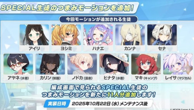 10 月 22 日维护后,爱莉、喜美、花绘、环奈、濑奈、绫音(泳装)、花凛(制服)、和香(温泉)、日向(泳装)、真纪(露营)、澪纱(魔法)共 11 名 SPECIAL 学生将实装捏取动画。