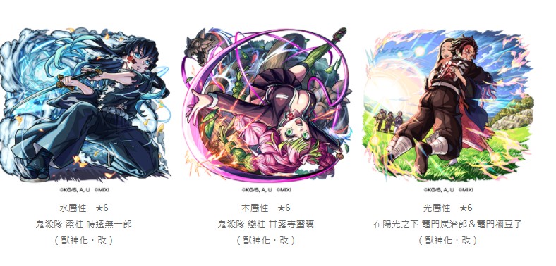 此外,在以前的合作活动转蛋中登场过的角色也会再度登场,第 3 弹合作活动中登场过的「时透无一郎」、「甘露寺蜜璃」、「灶门炭治郎&灶门祢豆子」兽神化・改解禁。