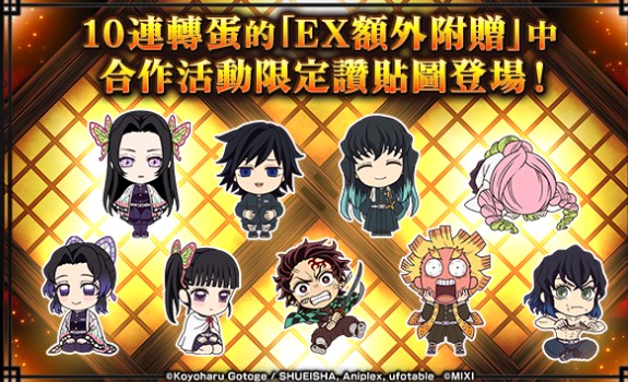 同时,以 10 连转蛋抽转蛋「超兽神祭 × 鬼灭之刃」时,可从作为「EX 额外附赠」出现的 9 种「合作活动限定讚贴图」中,随机获得 1 种。